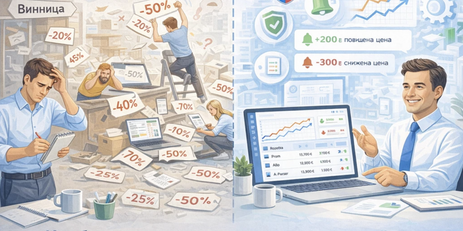 Спроби вручну перевіряти кожен товар на Rozetka чи Prom — це шлях у нікуди. Важливо використовувати програму для моніторингу цін, яка сканує картки товарів на маркетплейсах і сигналізує, якщо хтось «іде в мінус».