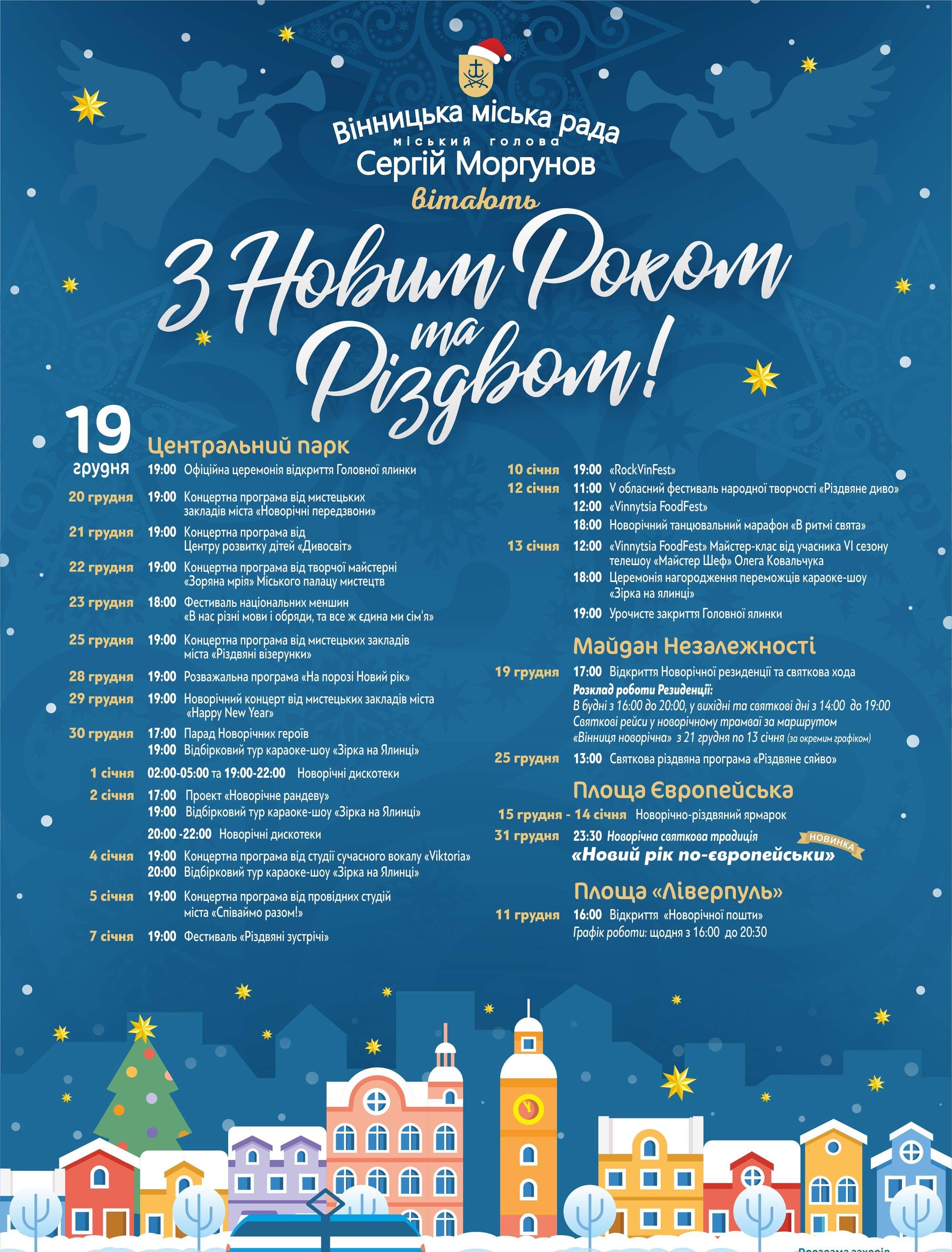 Саме на новорічно-різдвяному ярмарку, вперше зустрічатимуть новий рік за новою традицією, про яку ми вже писали раніше, це зустріч Нового року біля Вежі та без Діда Мороза. Зустрівши новий рік вінничан та гостей міста очікують різноманітні конкурси, інтерактиви та святкова концертна програма. Святкування завершиться традиційно 13 січня на“Старий Новий рік” святковим концертом на закритті головної ялинки.